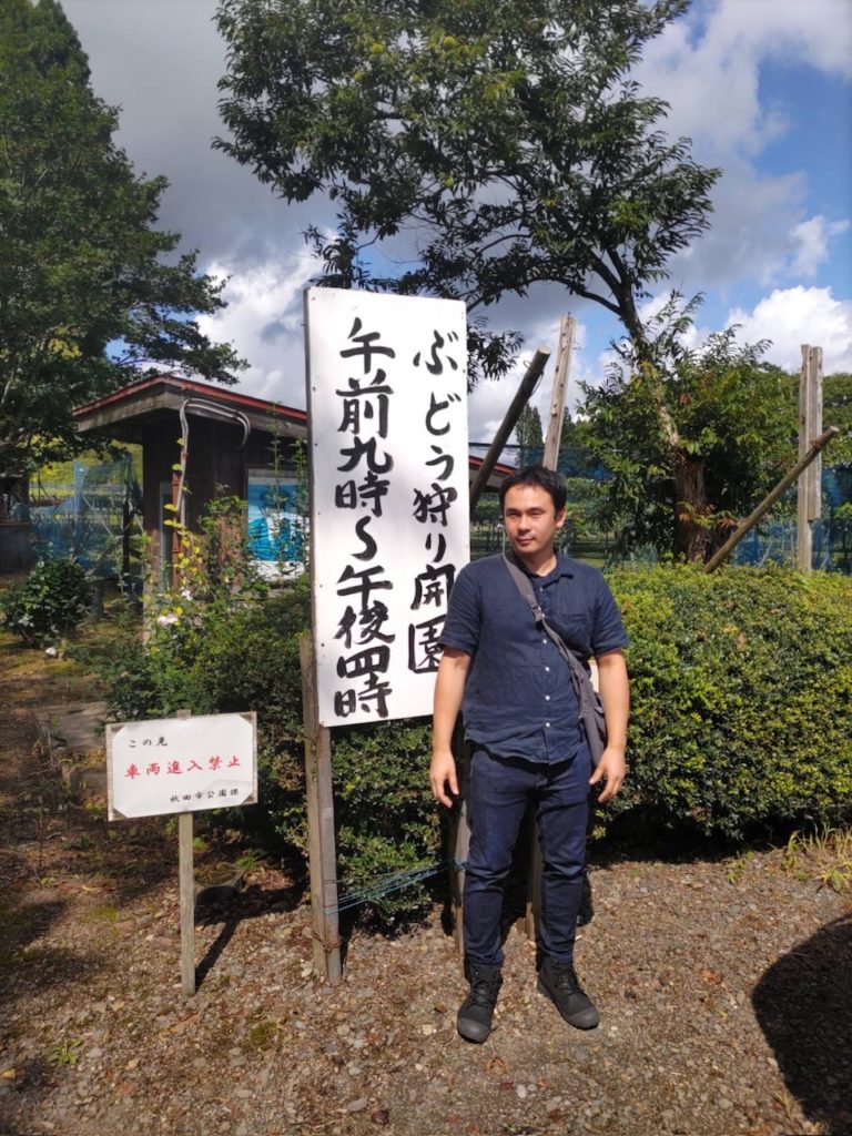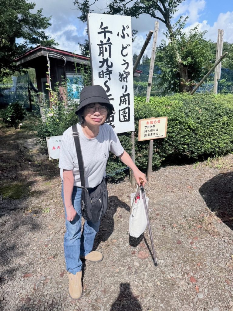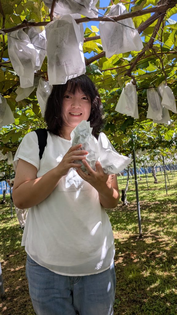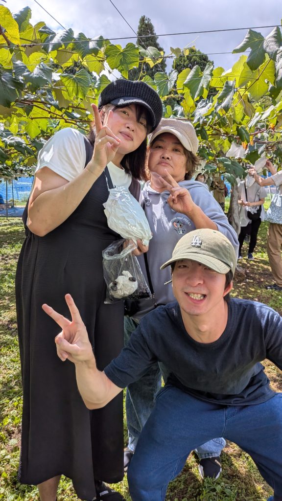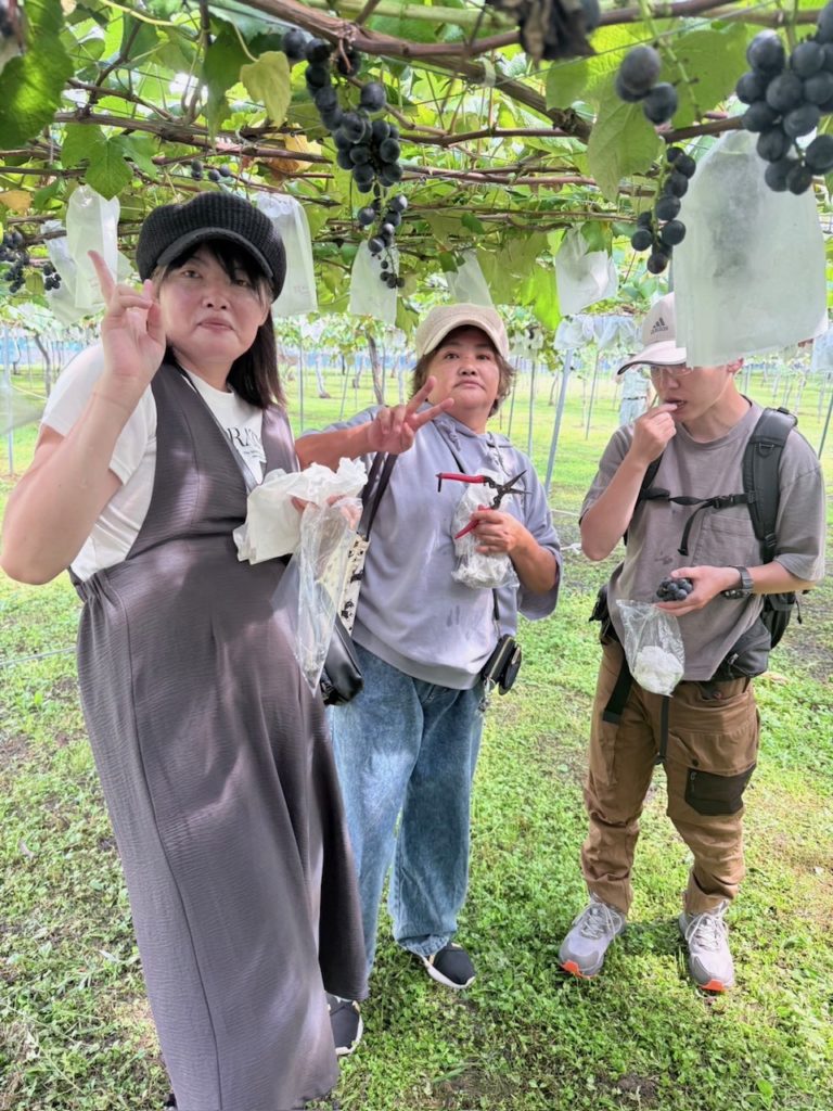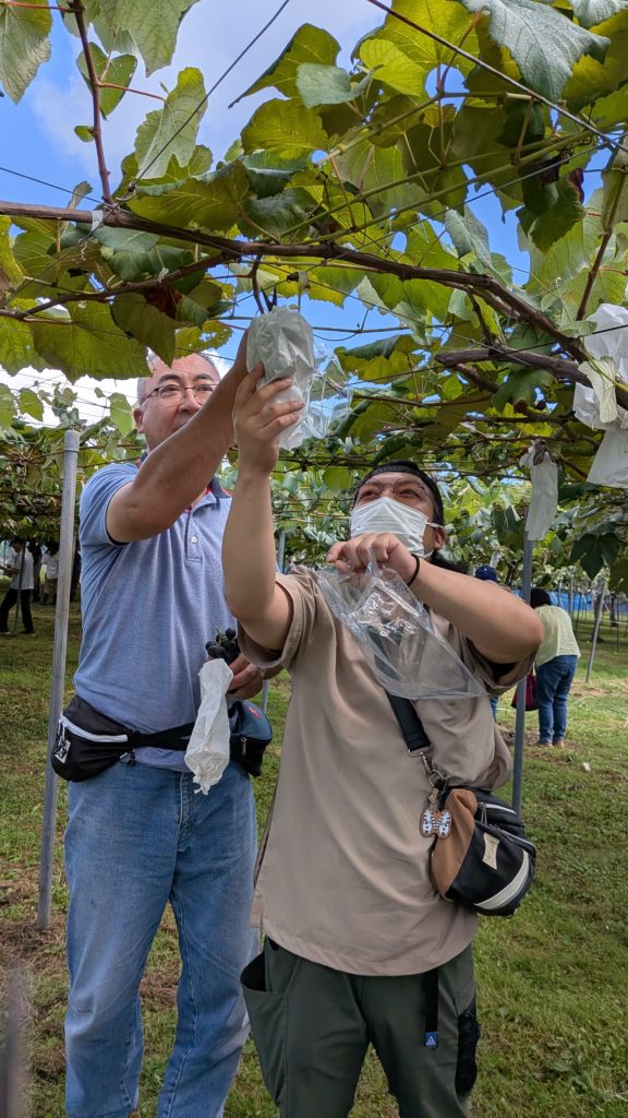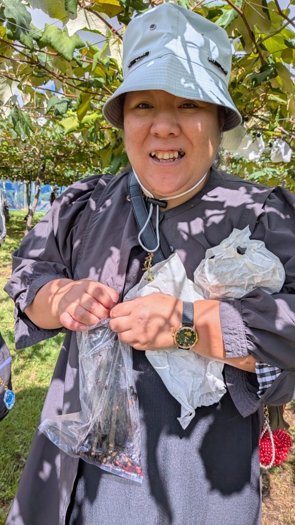夜中までの雨で少しぬかるんだ足元に気を付けながら、実の付きの良い🍇を見つけていざ収穫✂
